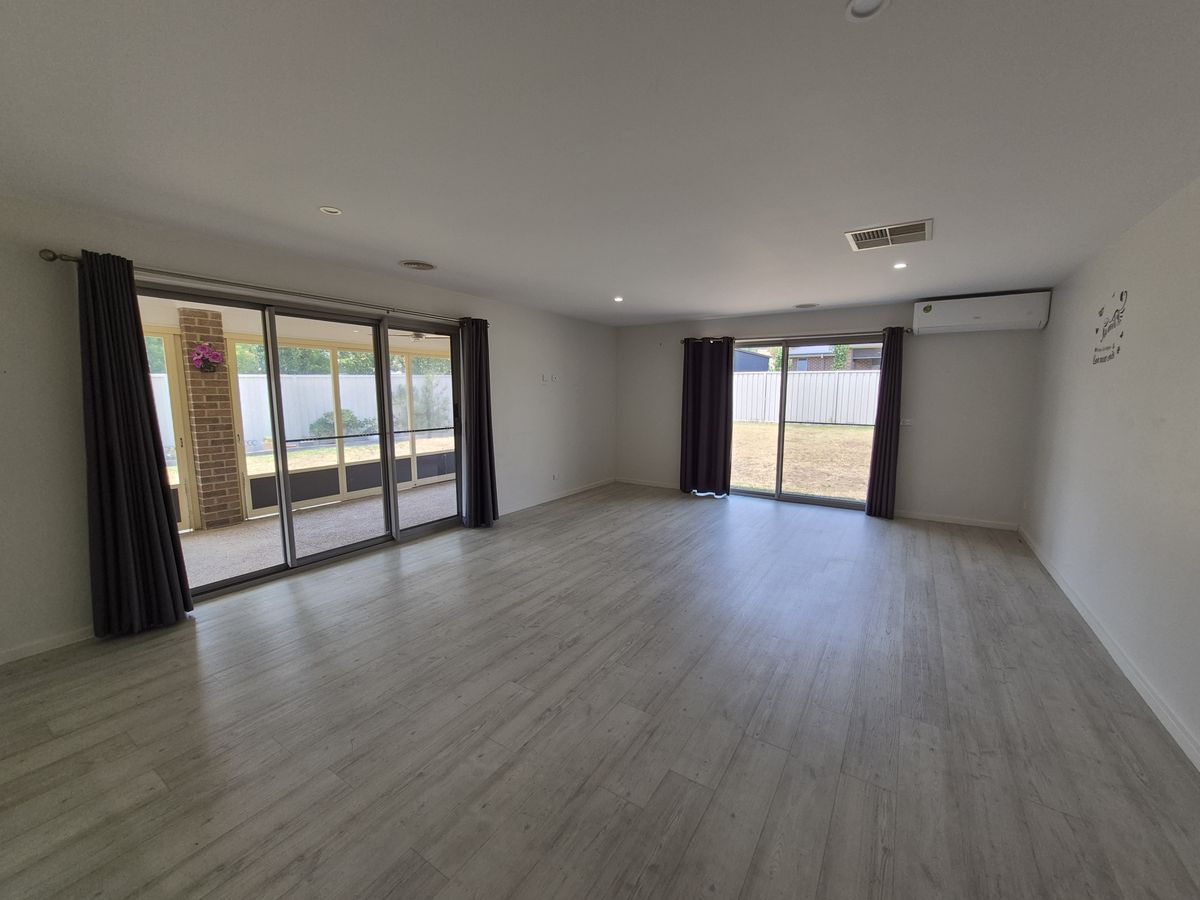 Open plan living with combined meals/living area with timber-look flooring